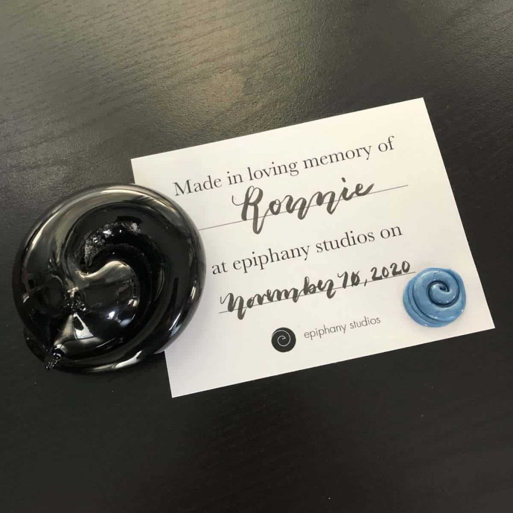 “Thank you to epiphany glass for making my hearts with my husbands ashes in them. I checked all around and found this place. They were the best people to talk to and they did a beautiful job on all my hearts I had made. I had 3 different ones made for me, my Daughter, and my Granddaughter. They all turned out beautiful. We love them and the little extra touches that they did was over the top. Thank you all very much !! I will be getting some more hearts made from you.” – E.H.