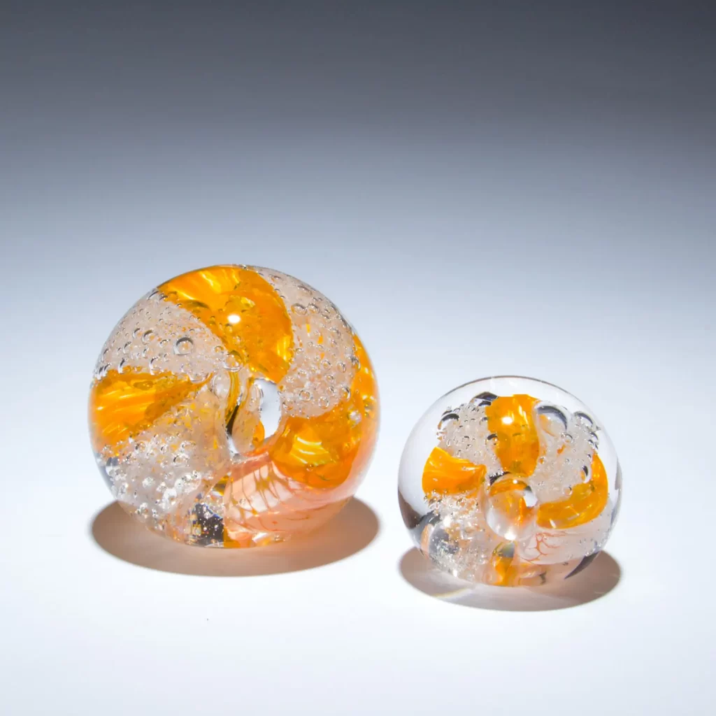 These beautiful hot-sculpted solid glass paperweights swirl vibrant colors along with your loved one’s ashes. The celestial, striking white trail of ash plays sweetly with the vibrant glass colors amid a cascade of pearl like bubbles. The joyous energy and motion reminding you that the spirit of your loved one will last into eternity. Have one made for yourself or order a collection to share memories over at a family reunion. The small marbles can be carried with you during important events like a wedding or graduation to remember someone important and to feel their presence.